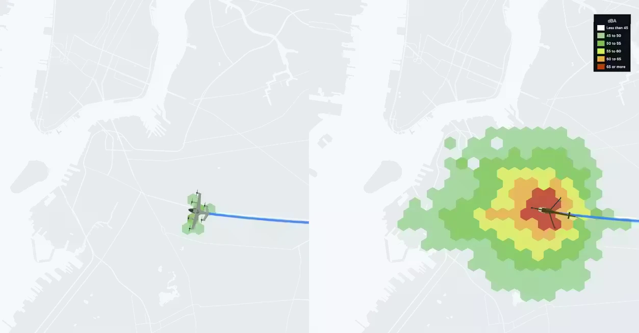 In the development of our eVTOL aircraft, we prioritized minimizing its acoustic impact as a necessity in order to operate close to communities without disrupting daily life. During 2022, we partnered with NASA to confirm our aircraft’s acoustic profile using a field array of 50+ specialized microphones. The testing confirmed the revolutionary, low-noise footprint we set out to achieve, with our aircraft registering just 45.2 A-weighted decibels during overhead flight from an altitude of 1,640 feet (500 meters) – exponentially quieter than today’s helicopters.